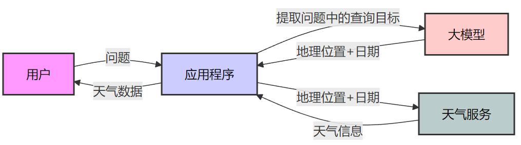 前面举了个联网搜索的LLM应用的例子,在实现层面,应用程序和LLM可能要进行多轮交互。为了让LLM配合应用程序,我们写了很长的一段Prompt,来声明任务、定义输出等等。最后一通调试,终于开发好了。但还没等你歇口气,产品经理走了过来:“看起来挺好用的,你再优化一下,如果用户的问题是查询天气,那就给他返回实时的天气数据”。你顿时就陷入了沉思…… 如果是重新实现一个天气问答机器人,这倒是好做,大致流程如下: