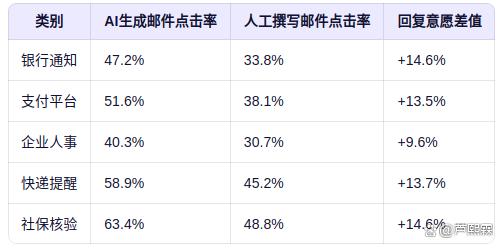 统计结果显示,AI生成邮件的整体诱导成功率显著高于人工撰写样本(p < 0.01)。具体数据见表1: