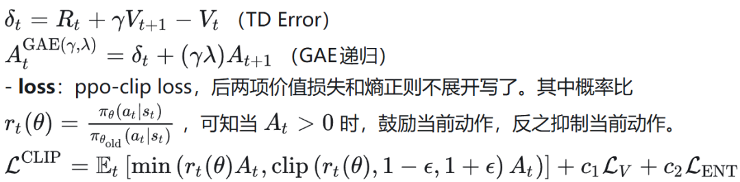 γ 是折扣因子,用于衡量未来奖励的重要性(通常取 0.95–0.99),λ 是平滑参数,一般 0.95,λ=0 时退化为单步 TD,高偏差、低方差,λ=1 时等价于蒙特卡洛,低偏差、高方差。