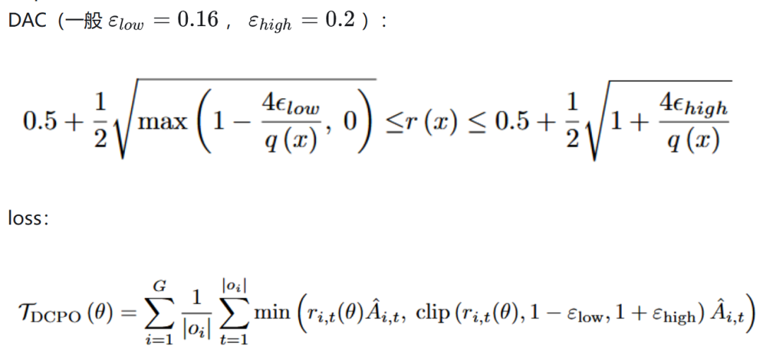 1)提出 Dynamic Adaptive Clipping (DAC)。和 DAPO 类似,都是解决传统固定裁剪边界对所有 token 一视同仁,不利于低概率 token 的探索的问题,根据每个 token 的旧概率 q(x) 动态调整 clip 边界。