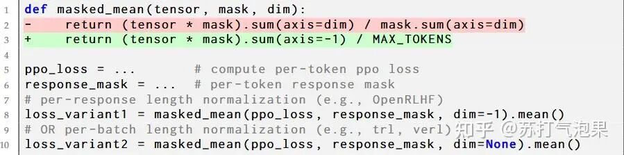 mask:改动了 masked_mean 函数,将 mask.sum(axis=dim)替换为固定值(如生成最大长度),避免因不同组的掩码长度不同而导致偏差,提升优化目标的无偏性。