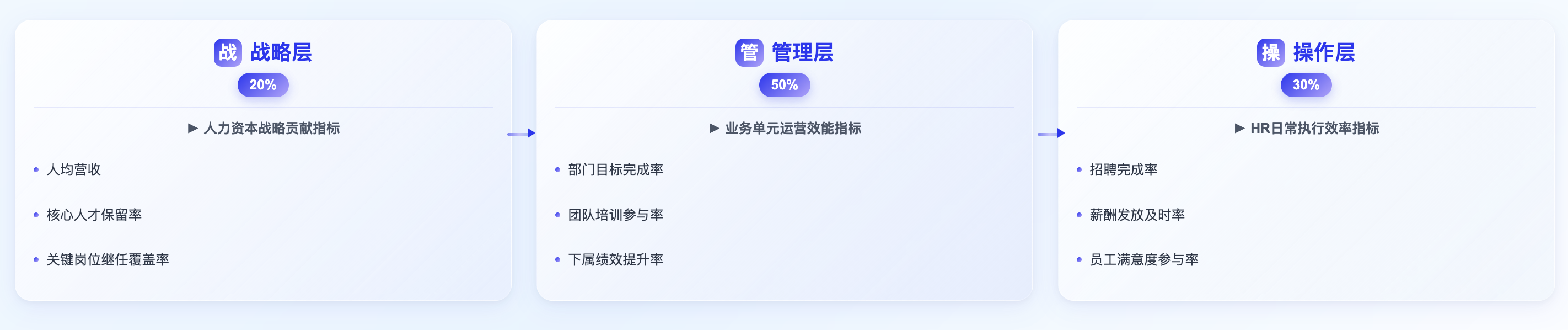 - 操作层指标(权重30%):聚焦于日常HR运营的效率和质量。例如,招聘完成率、培训计划完成率、薪酬发放及时率、员工满意度调查参与率等。这些指标是确保HR体系正常运转的基础,通过精细化管理提升日常运营效率。