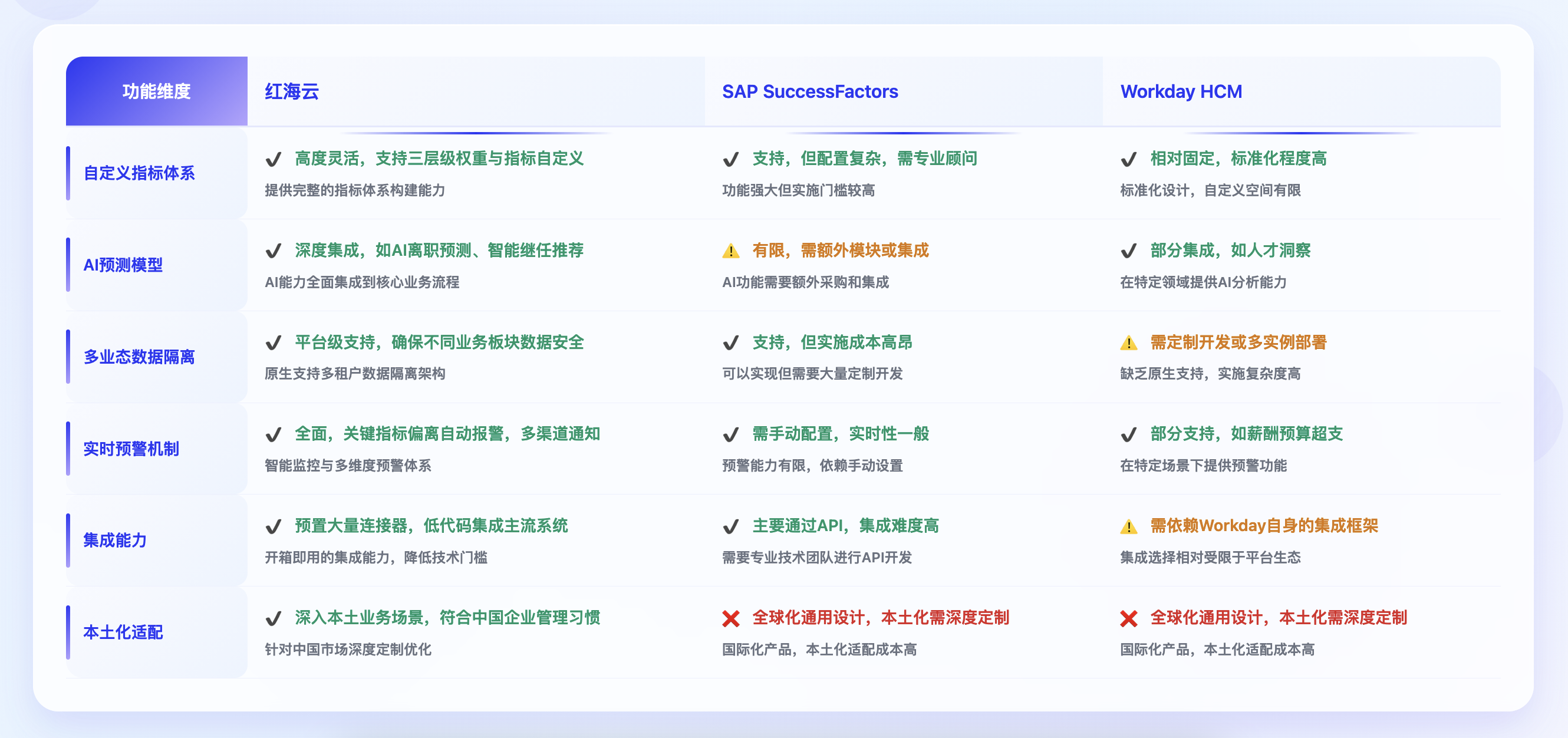 在HR数据分析领域,市场上存在多种成熟的产品,如SAP SuccessFactors、Workday HCM、红海云、Oracle HCM Cloud等。它们各有侧重,但通过对比我们可以清晰地看到不同产品的特点。