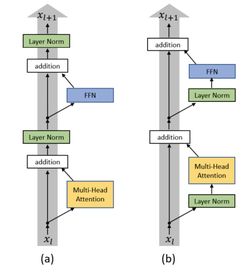- PreNorm(先归一化):将LayerNorm放在残差连接之前,即。
