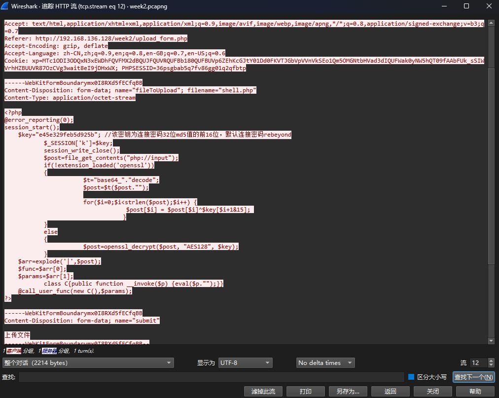 又是流量包,这次基本是HTTP流量。跟踪文件上传,发现上传了一个冰蝎马:
