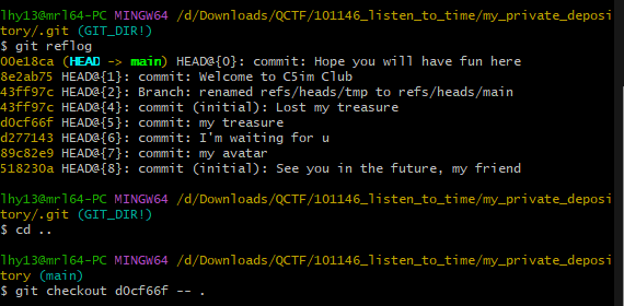 t1me的md5值就是压缩包密码。解压后拿到一个.git目录,可以利用这个目录复原出一些文件,操作如下: