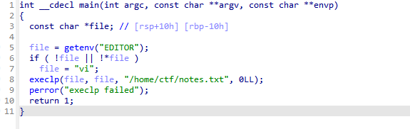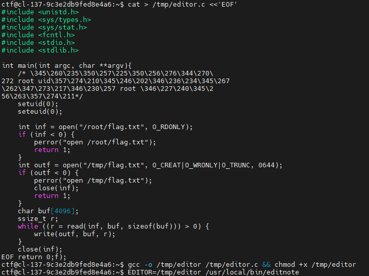 调用的是execlp,很好,这里注意不能直接利用这个可执行文件调用sh脚本,因为setuid二进制通过shebang脚本去执行外部代码时,内核会丢弃特权,导致提权失败,这里需要写入一个c并编译来调用:
