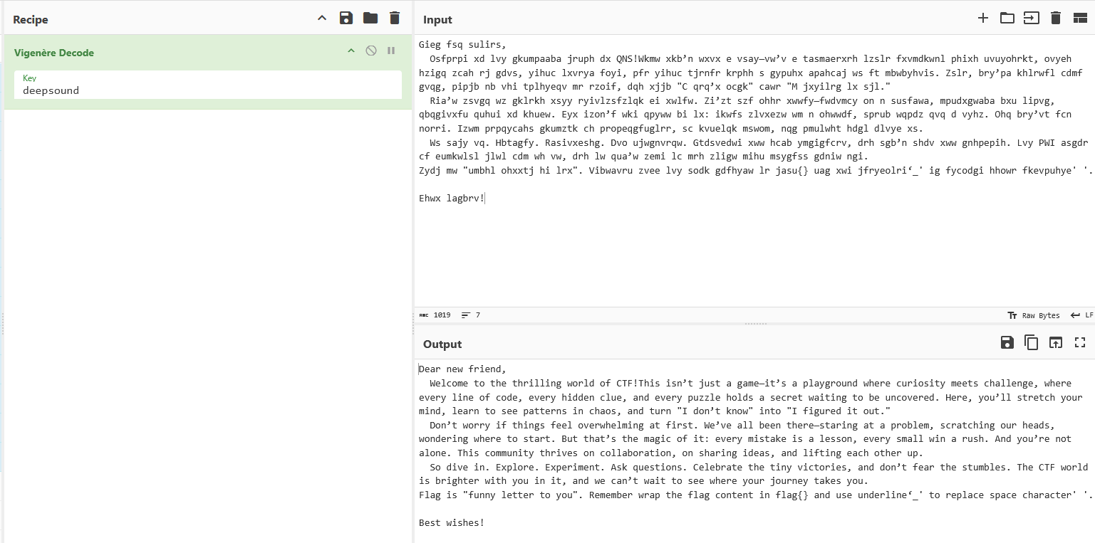 将得到的内容解维吉尼亚,key是deepsound,找到flag: