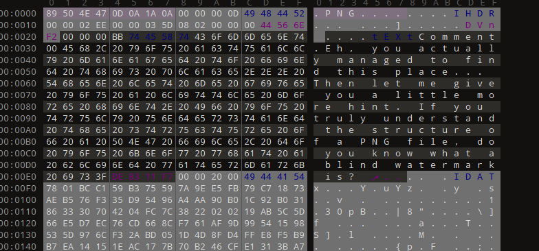 提示盲水印,一般盲水印需要2个图片。观察PNG结构发现明显异常: