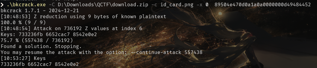 获取到zip以后,发现加密算法+压缩方法是ZipCrypto Store,可以直接对png明文爆破: