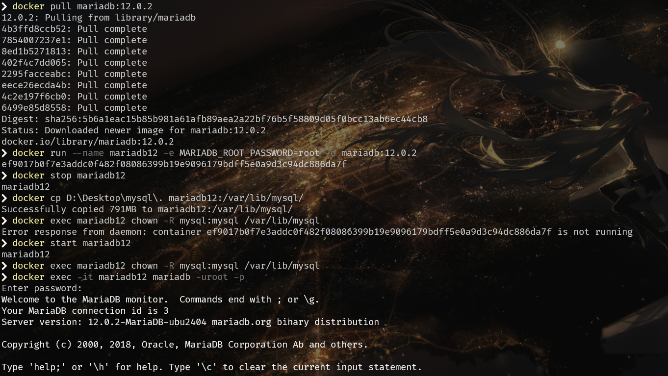 把整个数据库/var/lib/mysql给dump下来,docker拉一个相同版本的环境,把dump下来的内容导入进去: