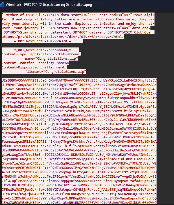下载流量包,发现走的是SMTP,那么直接解开这个对应的base64就可以拿到一个zip: