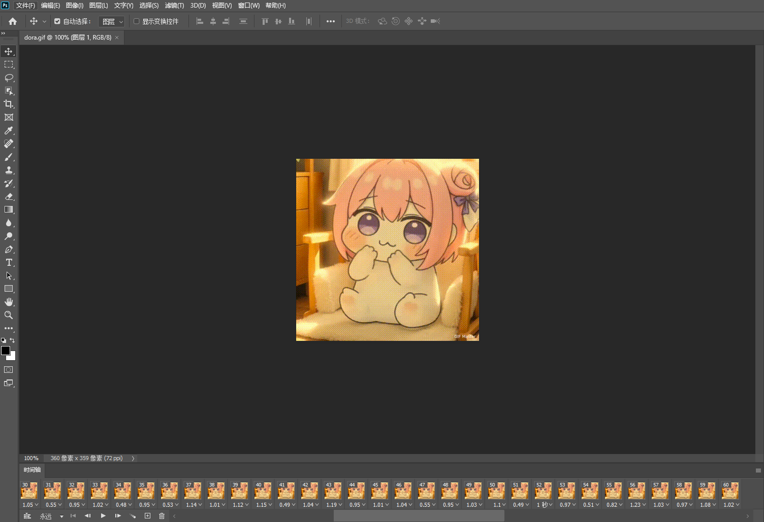 把这个gif导入ps,查看时间线就可以发现问题了:
