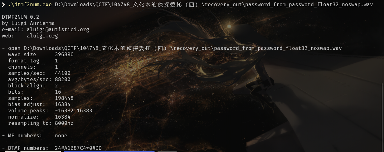 其中解出来的password_from_password_float32_noswap.wav是电话按键声,直接用dtmf2num工具解出flag的压缩包密码即可: