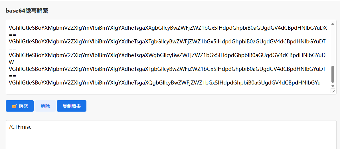 给了一个base8编码的字符串和一大堆base64的字母表。首先这一堆base64一般是banse64隐写的特征,找个在线网站可以解: