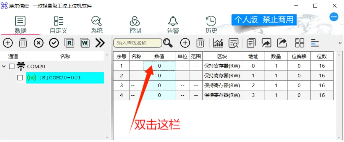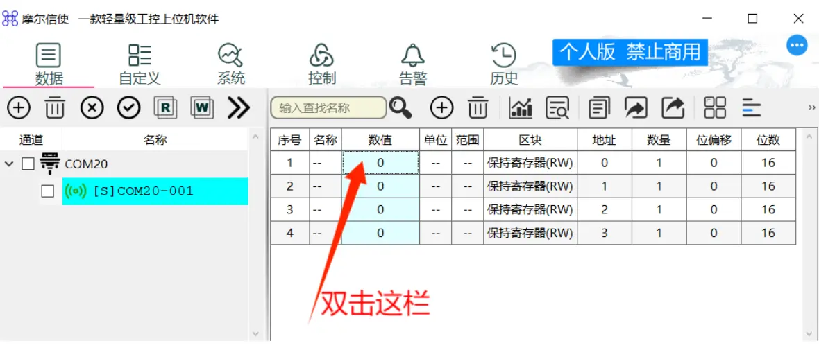 9.添加成功后,双击数值栏就可以获取目前从站的数据了,开发板做从站和主站连接通讯成功。