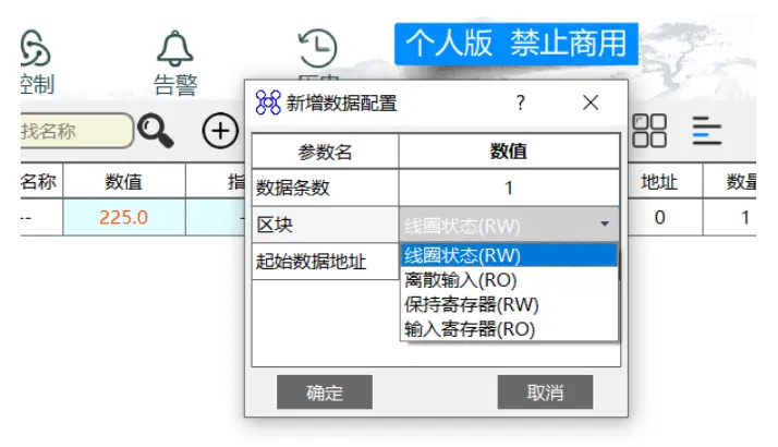 8.增加数据配置,根据需要选择读取的寄存器与线圈数据。