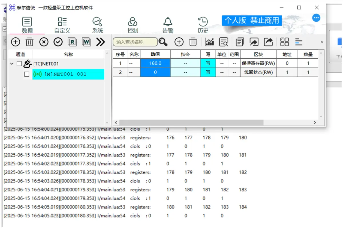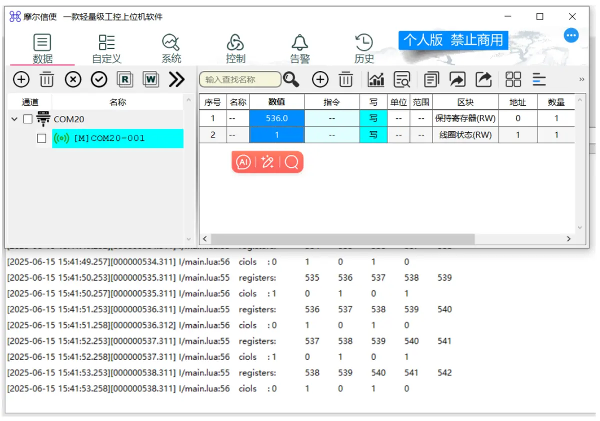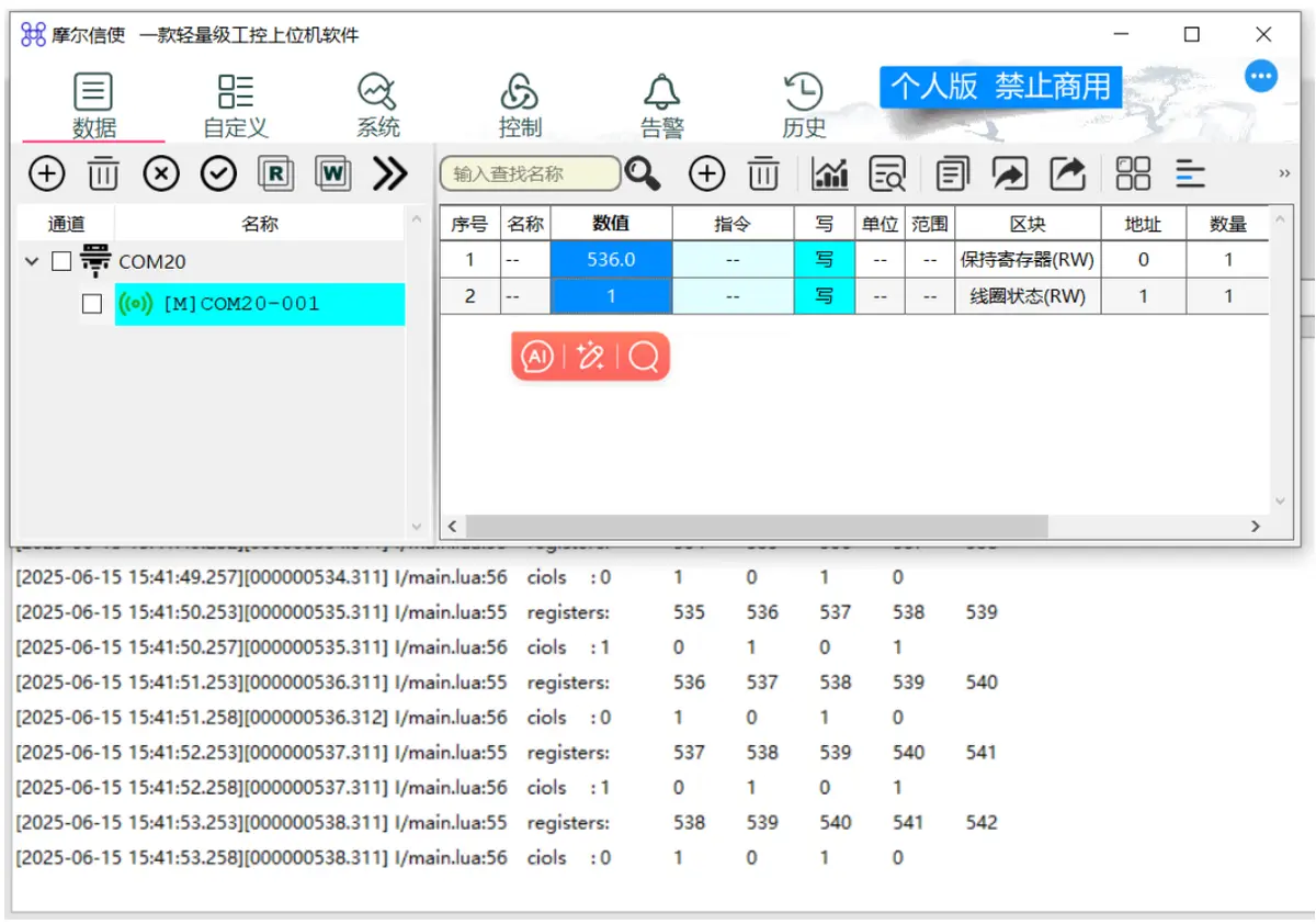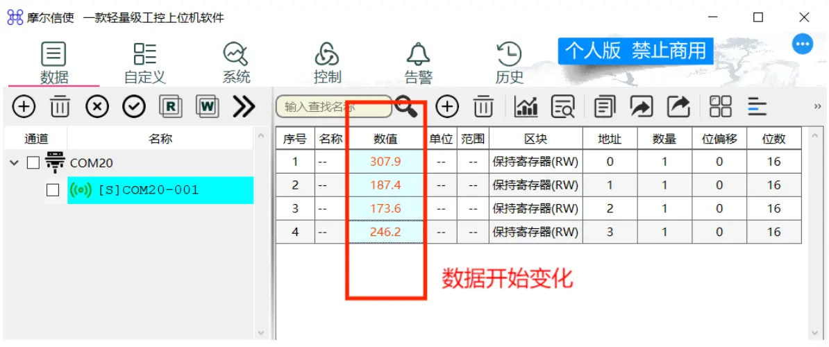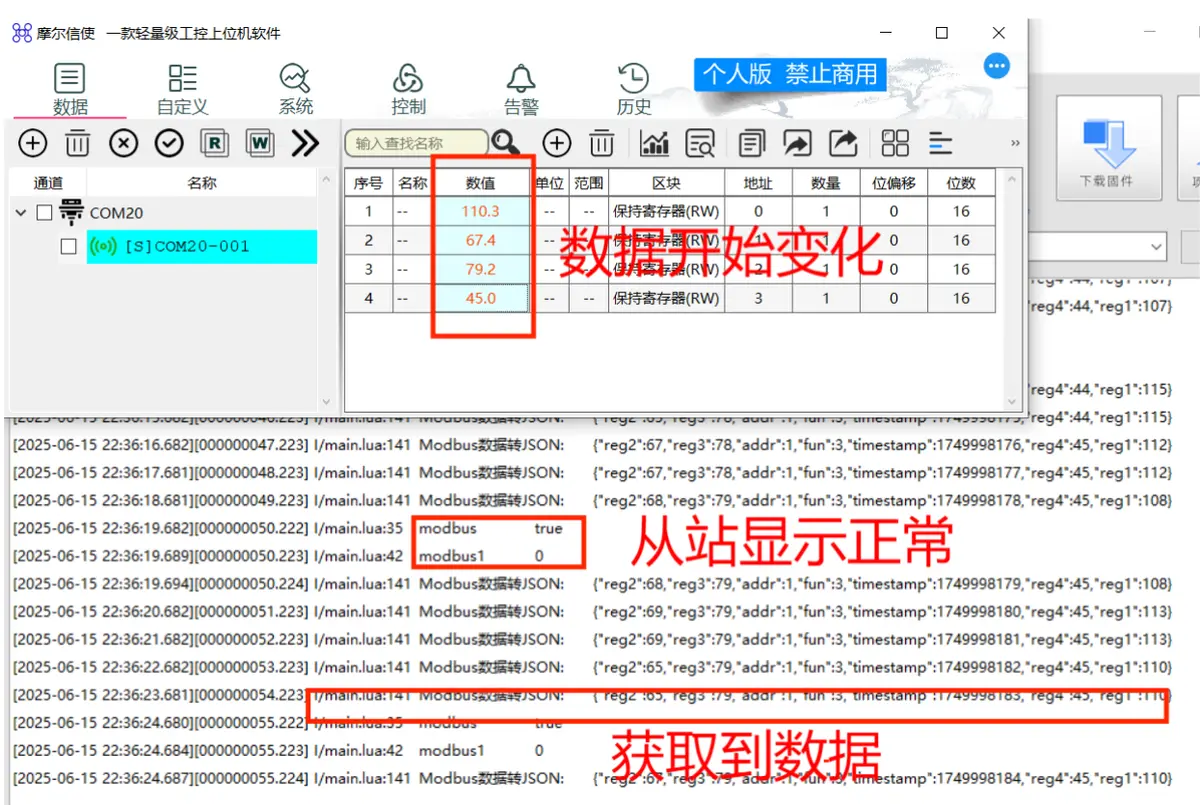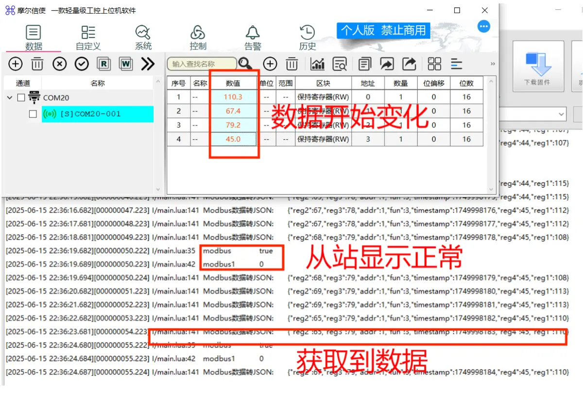 9.数据配置完成后,在主界面可以看到数值按照设置的通讯时间间隔开始变换,在日志中也可以看到收到的数据,modbus 连接和通讯成功。