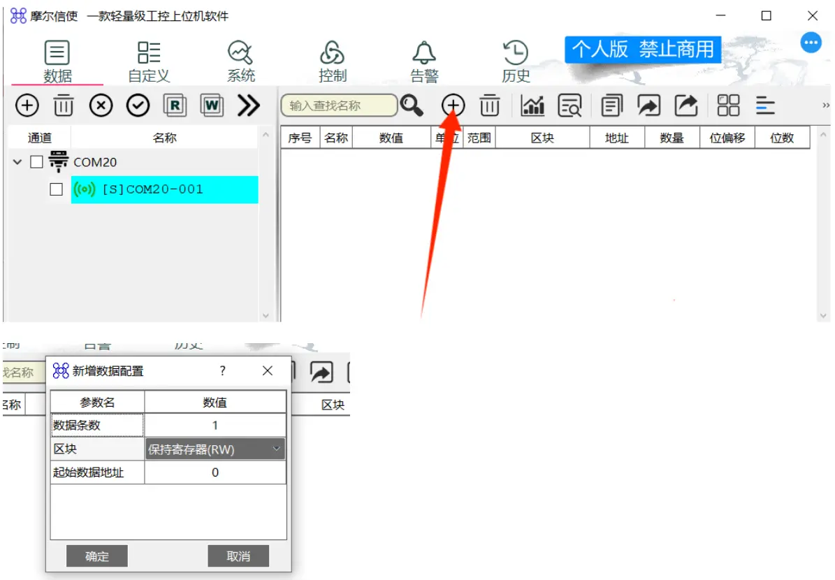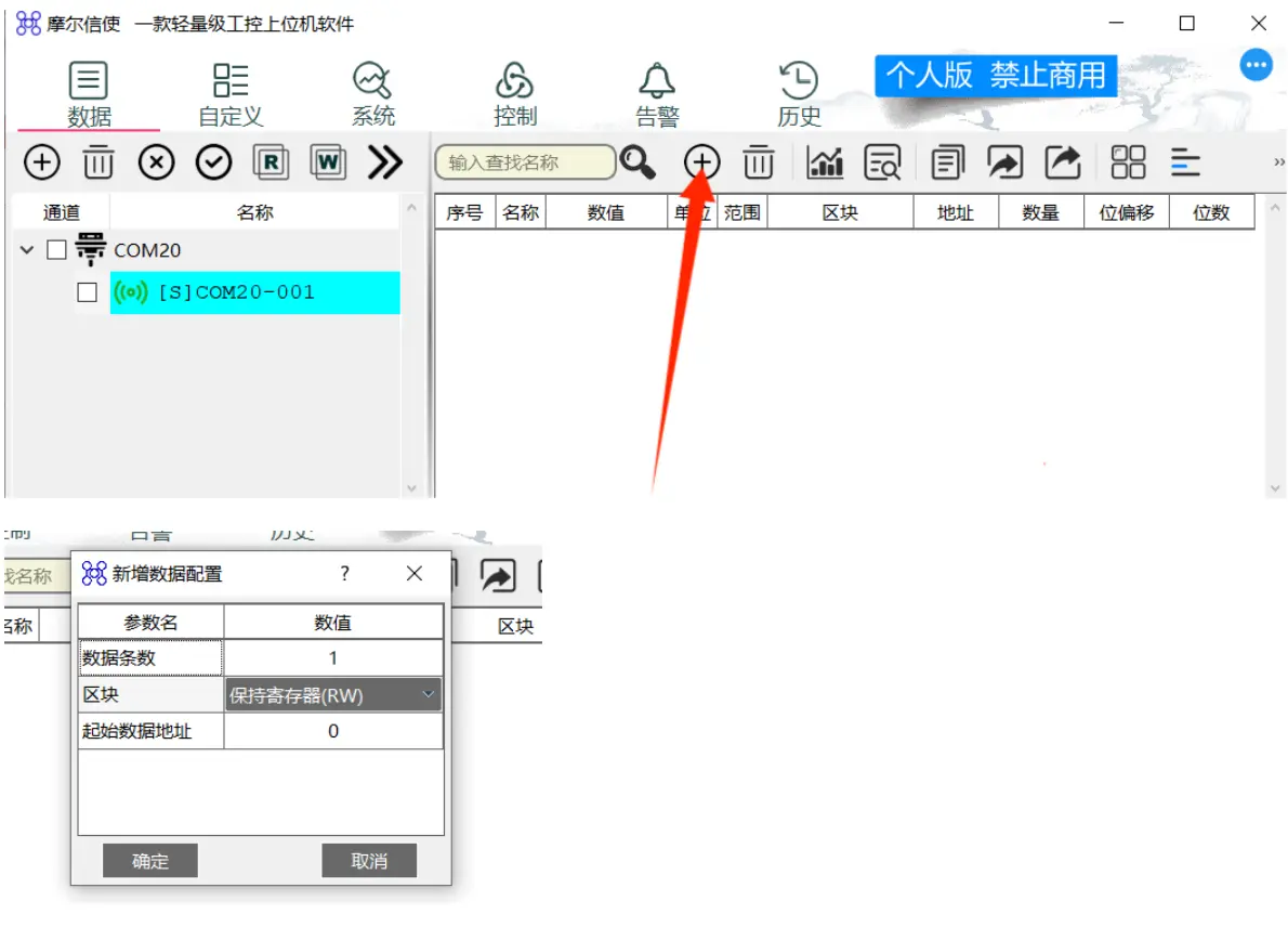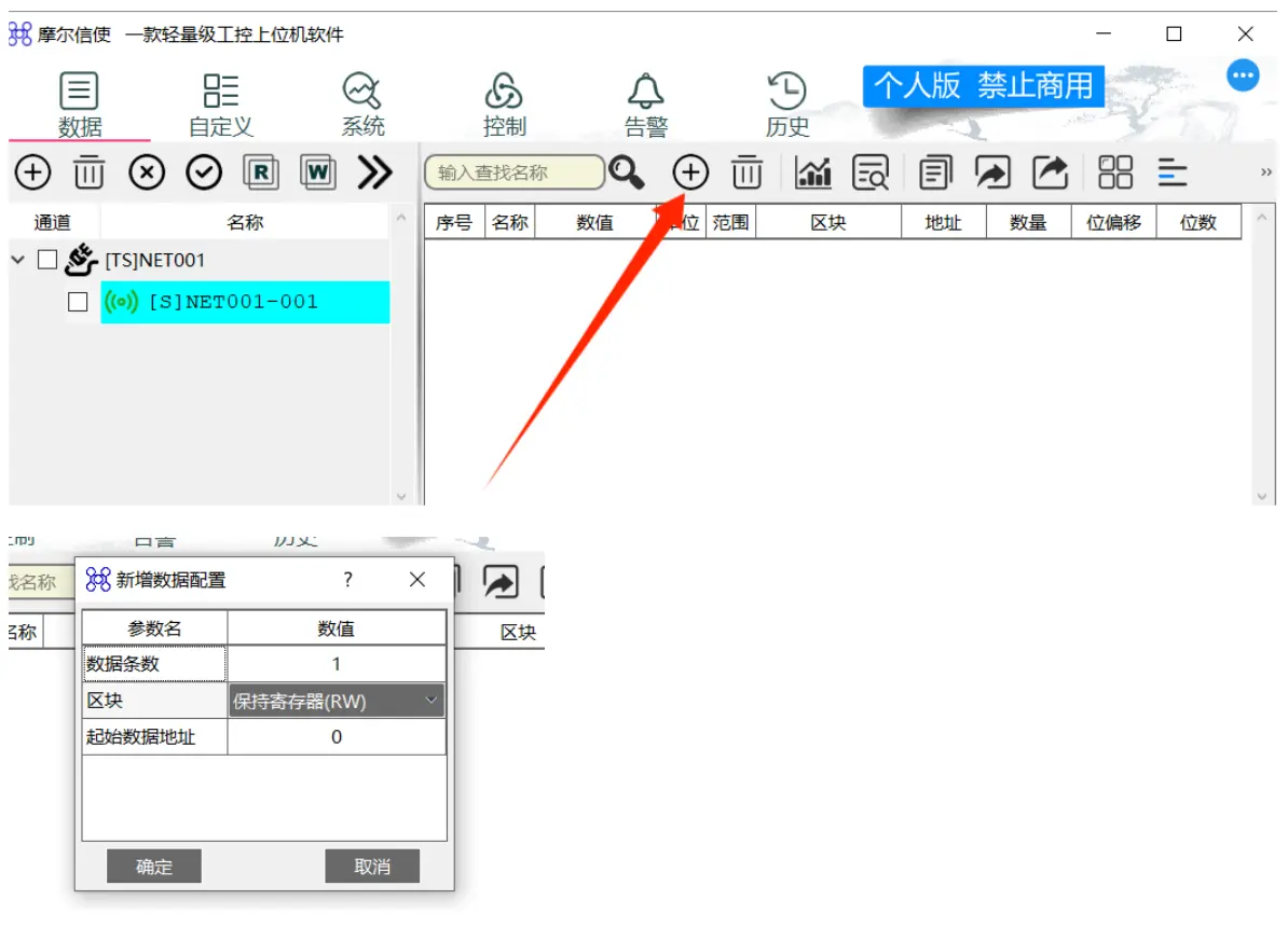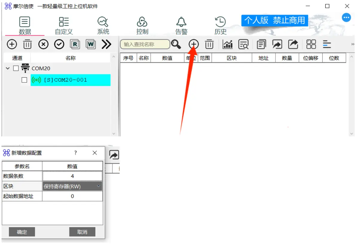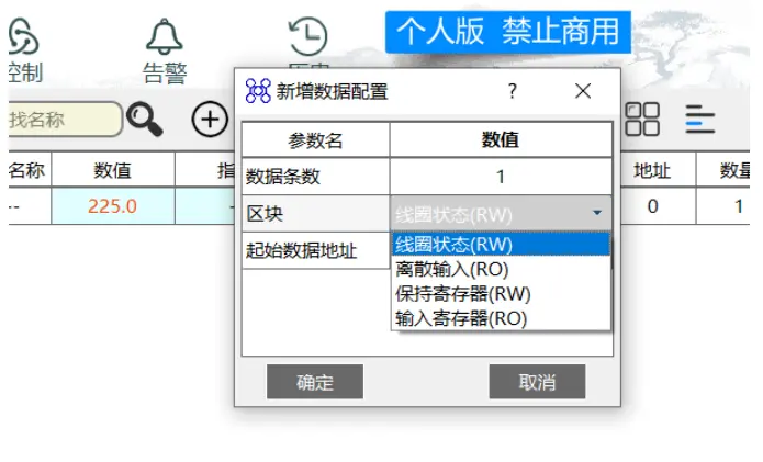 8.增加数据配置,根据需要选择寄存器或线圈数据。