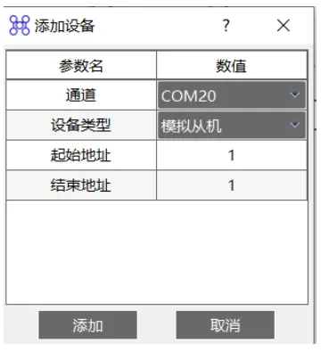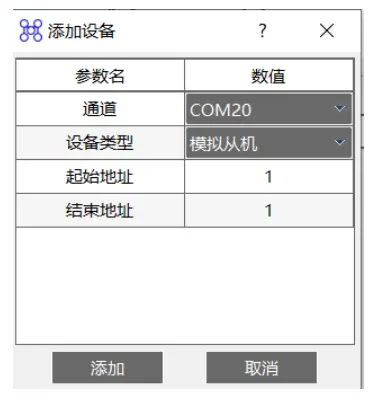 7.通道选择刚刚配置过的 485 通道 COM20,设备类型是模拟从机,地址是添加从站的 id。
