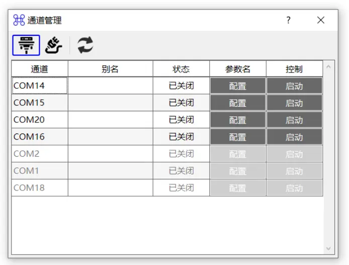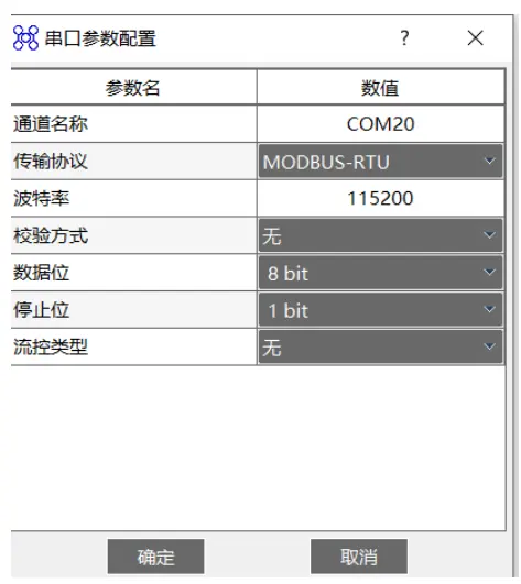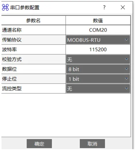 5.点入配置,按照代码中 uart.setup 设置参数后,点击确定即可,设置完毕后在通道管理界面配置的通道显示属于正常状态,用户如果接的是自己的下位机,请将 uart.setup 传入的参数成自己下位机的配置参数。