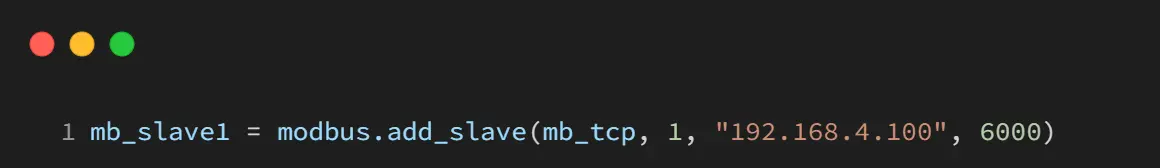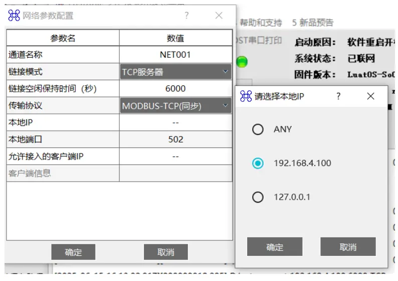 5.连接模式选择 tcp 服务器,本地 ip 在把脚本烧录后可以看到开发板分配的 ip,端口号设置为代码中 mb_slave1 = modbus.add_slave(mb_tcp, 1, "192.168.4.100", 6000)创建从站的端口号。