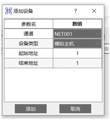 7.通道选择刚刚配置的 NET001 网络通道,设备类型是模拟主站,地址是创建从站的 id。