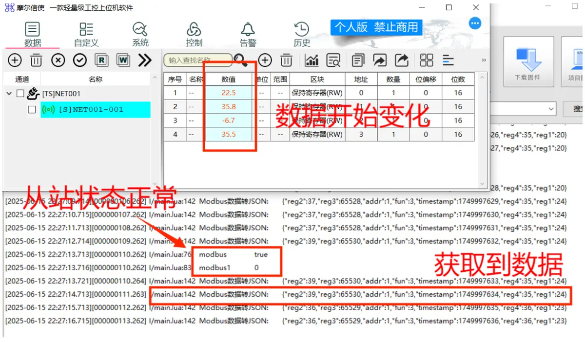 10.设置完成后则可以看到模拟从机数据开始变化,日志上显示开发板获取数据,主站与从站连接通讯成功。