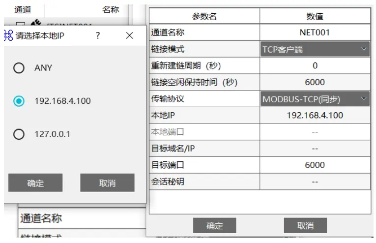 7.通道选择刚刚配置的 NET001 网络通道,设备类型是模拟从机,地址是创建从站的 id。