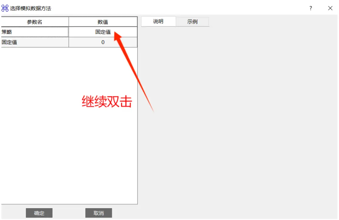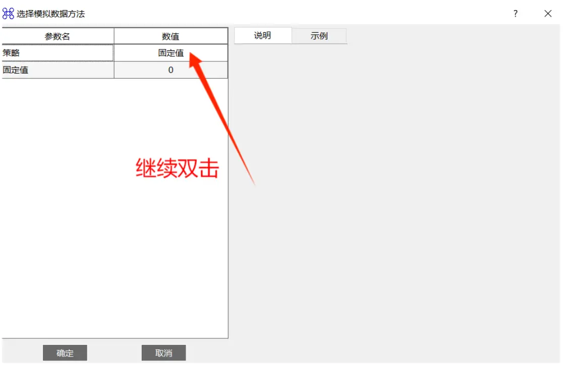 点击确定后可以看到增加了 4 个条目,双击数值一栏,然后再双击固定值一栏即可按需选择模拟数据的方法。