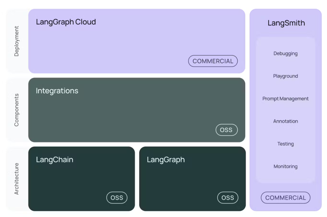 例如,Replit 在几个月前发布的智能体就是基于 LangGraph 和 LangSmith 构建的。值得一提的是,LangSmith 是 LangChain 生态中的一款闭源工具,专注于 LLM 运维领域,主要提供可观察性和监控功能,同时也是该公司的主要收入来源。