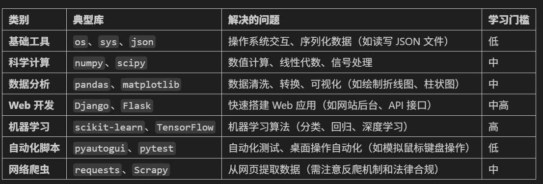 3. 库(Library):由一个或多个相关包,能够实现特定功能的集合。库分为官方库和第三方库。其中大部分第三方库需要通过pip install安装。