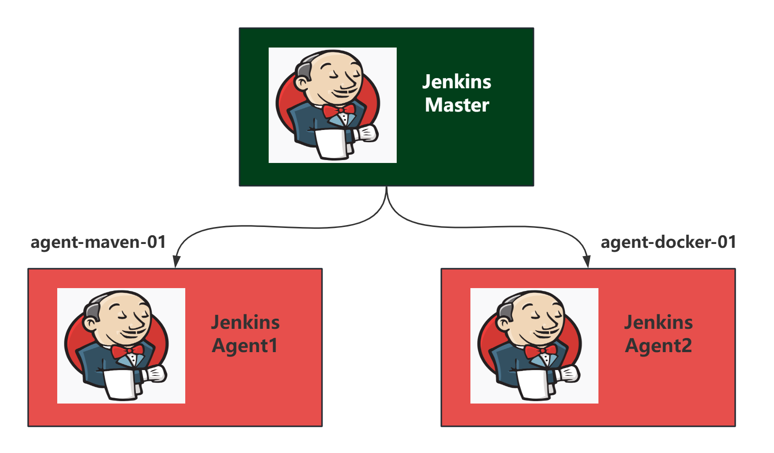 假设现在有三台服务器,一台安装有 Jenkins Master 节点;一台安装有 Maven 环境(agent-maven-01),还有一台安装有 Docker 环境(agent-docker-01)。我们希望 Docker 镜像构建任务能运行在 agent-docker-01 上,Maven Jar 包构建任务能运行在 agent-maven-01 上。针对这个场景,我们来配置一个 Jenkins 集群。