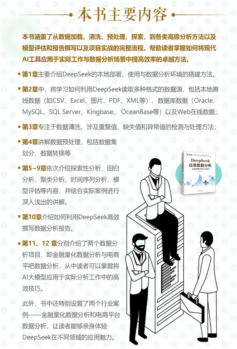 《DeepSeek高效数据分析:从数据清洗到行业案例》聚焦DeepSeek在数据分析领域的高效应用,是系统讲解其从数据处理到可视化全流程的实用指南。作者结合多年职场实战经验,不仅深入拆解DeepSeek数据分析的核心功能——涵盖数据采集、清洗、预处理、探索分析、建模(回归、聚类、时间序列等)及模型评估,更通过金融量化数据分析、电商平台数据分析等真实行业案例,搭配报告撰写技巧,提供独到见解与落地建议。助力职场人在激烈竞争中凭借先进技能突破瓶颈,实现职业进阶,开启发展新篇。