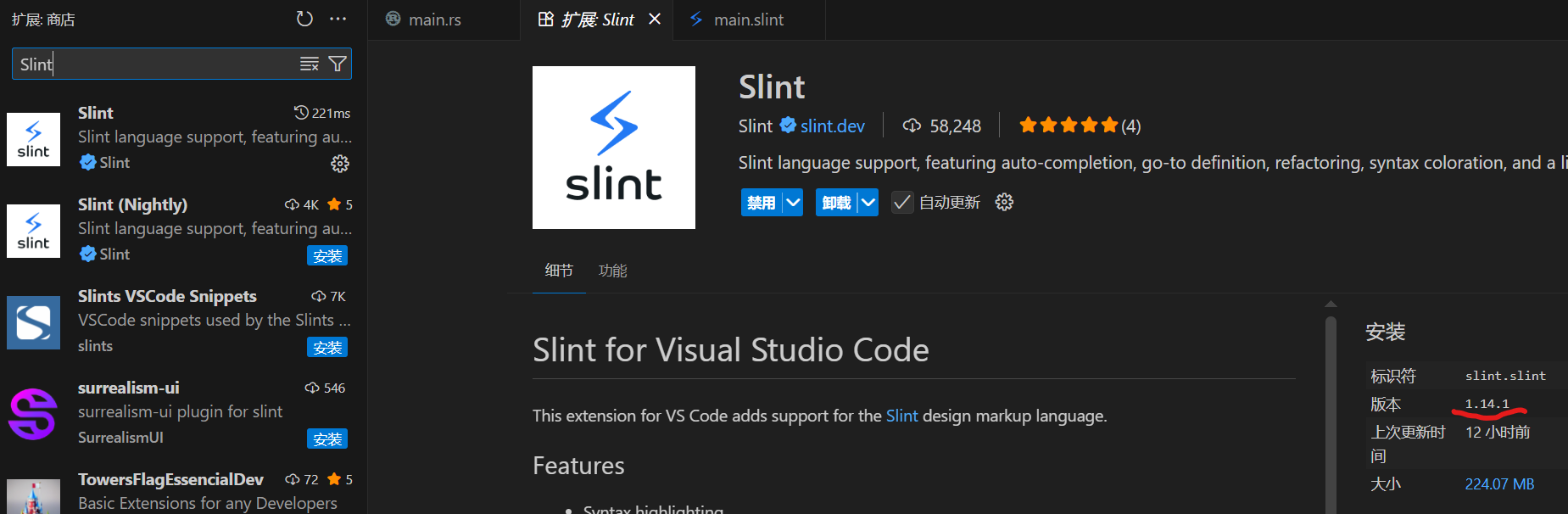 开发上面的slint代码是不是也很头痛?别怕,咱有工具。例如:在VSCode下,我们可以用“Slint language support”插件,安装了这个插件后,咱们就可以可视化的开发界面了,与惯用的IDE没啥两样。下图是在VSCode的扩展商店中找到Slint的截图,这里需要注意版本,如果你用的是“1.14.1”版本的slint,那么下面的插件也要选择适配“1.14.1”的。