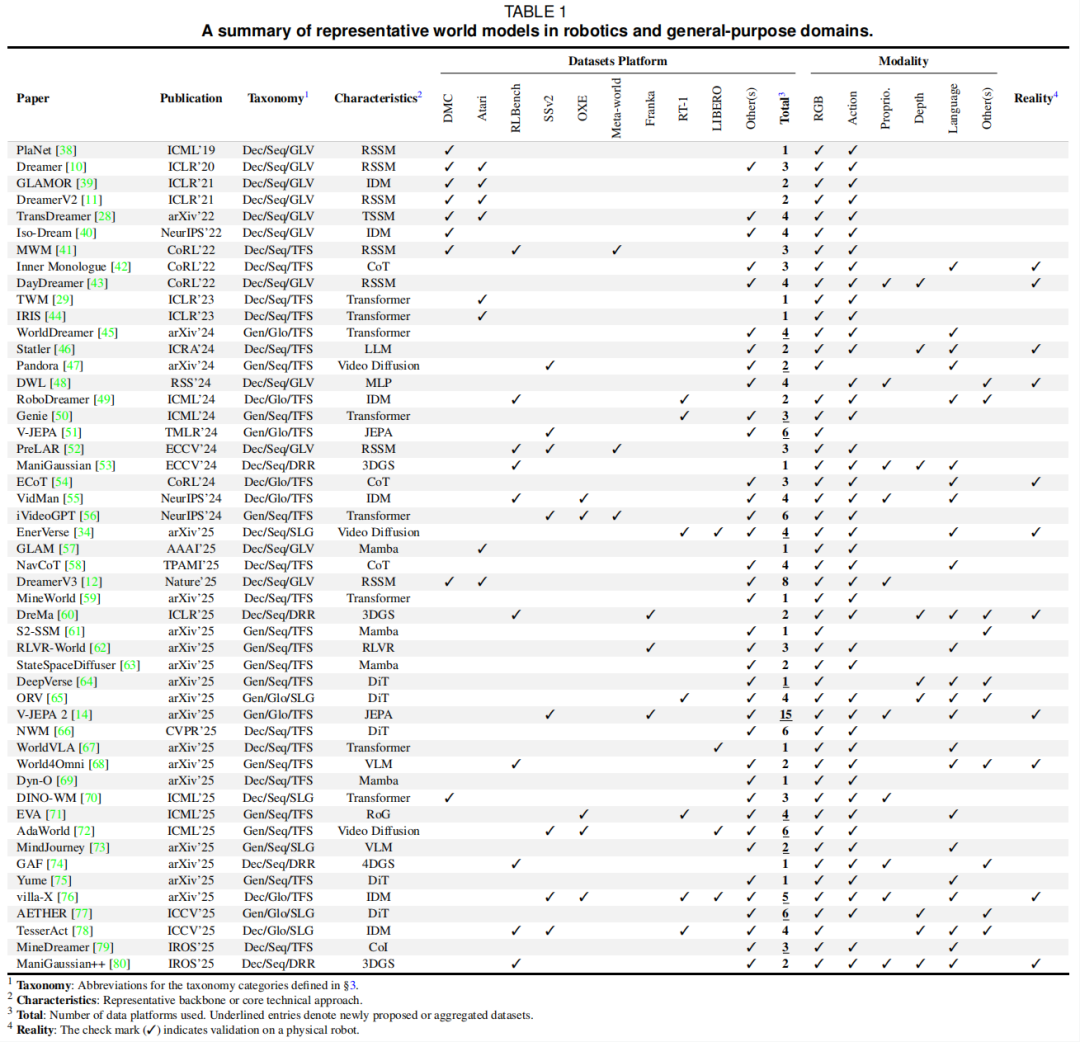 - 交互式基准:如DeepMind Control(DMC)套件、Atari游戏、Meta-World(多任务机器人操作)、RLBench(机器人操作任务集)、nuPlan(自动驾驶规划)、LIBERO(多机器人任务基准)等。这些基准提供统一环境和任务接口,可用于训练和评测世界模型的决策能力。