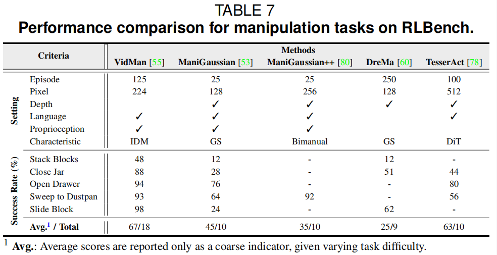 - 空间表征:关注对空间状态的建模策略,涵盖了四种主流方式 :全局潜变量、Token特征序列、空间潜在网格、分解式渲染。