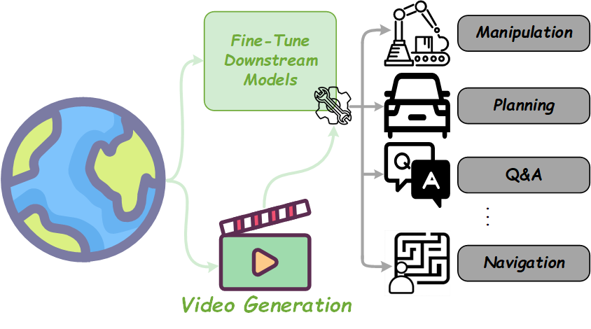 - 定位为任务无关 (task-agnostic) 的环境模拟器,着眼于对环境动态的广泛预测和包保真生成。这类模型的目标是捕捉环境演化的通用规律,能够为下游任务提供可迁移的模型支持。