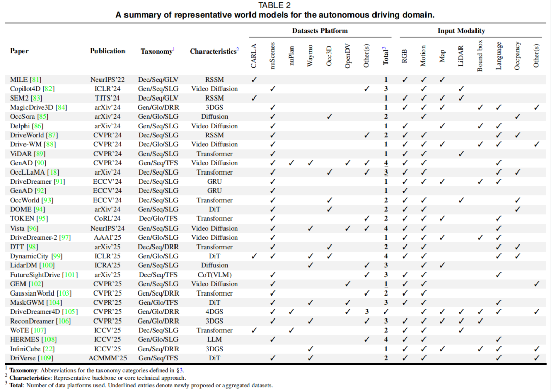 基于这套新颖的分类方法,可以清晰地对当前的世界模型工作进行分类。表1和表2分别汇总了一些World Model在控制和自动驾驶领域的代表工作。