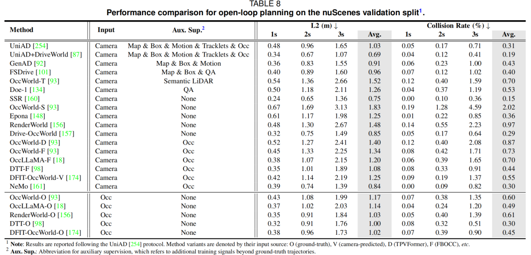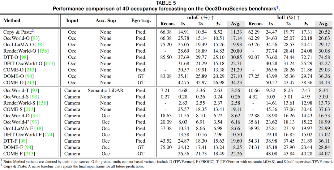 - 状态/语义一致性:评估模型是否理解了场景的结构和语义。如mIoU、mAP、Displacement Error、CD(点云结构相似度量)。