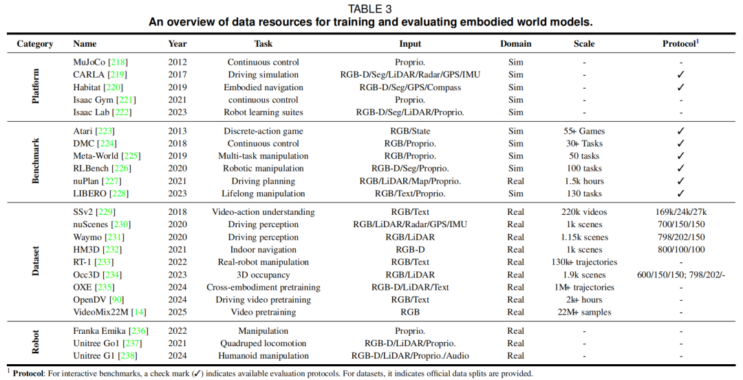 具身智能的数据资源因其任务和形态的多样性,可被划分为四类:仿真平台、交互式基准、数据集与真实机器人平台。表3将常见的一些数据平台进行了相应的整理。