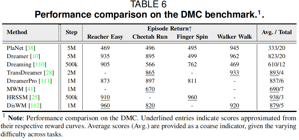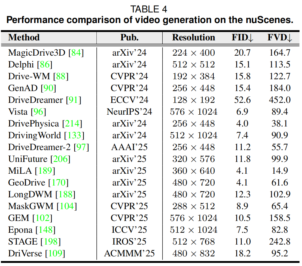 - 任务绩效指标:累积奖励、成功率、碰撞率。 理想情况下,我们希望指标不仅关注像素级误差,更关心物理一致性和任务成功。因此,新近的评测倾向于设计诸如物理合规性、因果一致性等指标来弥补传统指标的不足。 下面几个表格是一些世界模型在上述指标中的性能对比。