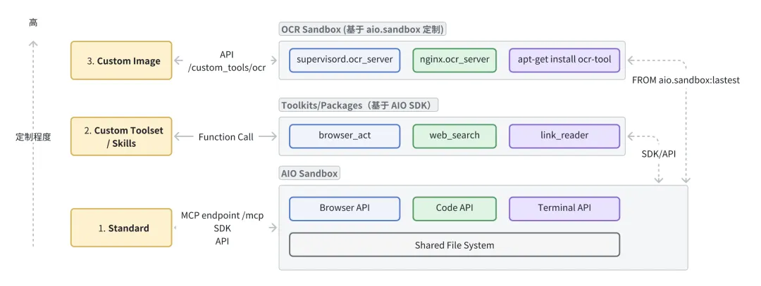 AIO Sandbox 面向 Agent 提供 Browser、File、Shell、Code 等基础能力,提供可扩展性支持开发者根据 Agent 需求组合与定制专属沙箱(如 AIO Sandbox for 移动端/医疗/法务/金融/科研)。 沙箱定制程度依次递增: