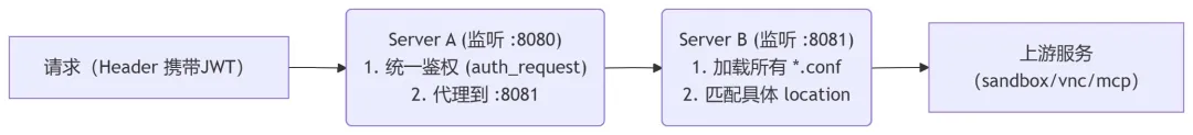Agent 在沙箱里会产生用户数据,为了在不侵入、不修改任何既有业务路由配置、同时不增加未来扩展的路由配置的心智负担的前提下,实现 AIO Sandbox 全局统一鉴权,在内部 Nginx 网关层设计了 ***“非对称加密 + JWT” 反向代理架构 *** 来实现鉴权: