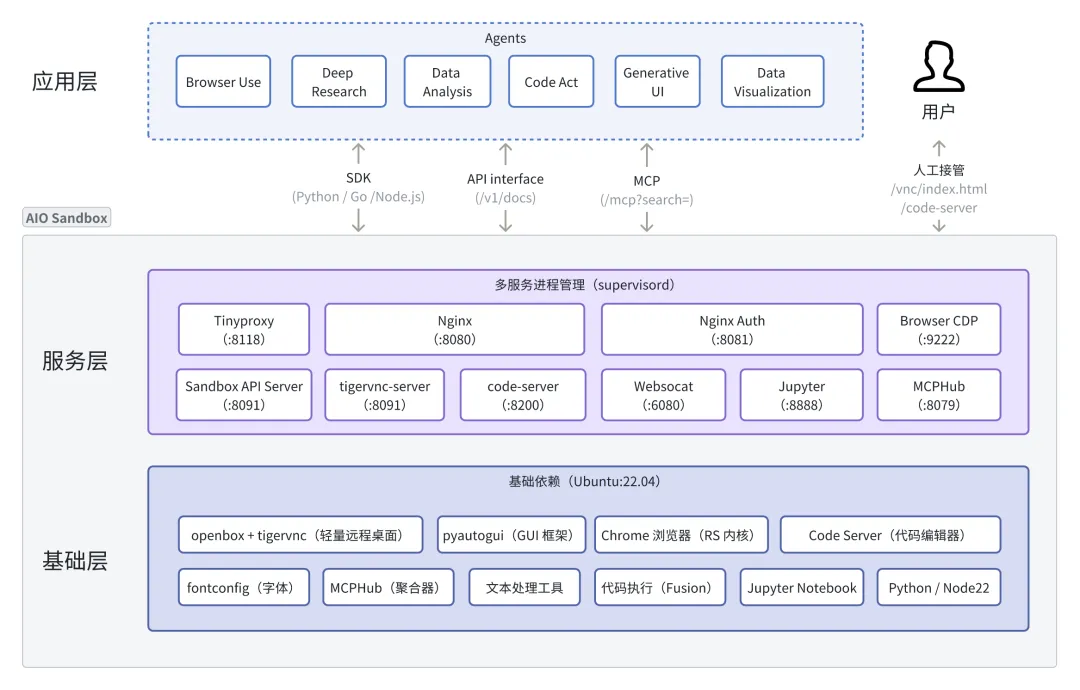 一句话介绍:AIO Sandbox 在一个沙盒内集成浏览器、代码执行、终端、可视化接管、正反向代理、MCP、鉴权等基础功能,可根据需求进行沙盒环境定制,让不同的 Agent “在一个环境容器内中更高效地完成任务”。