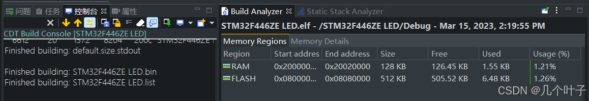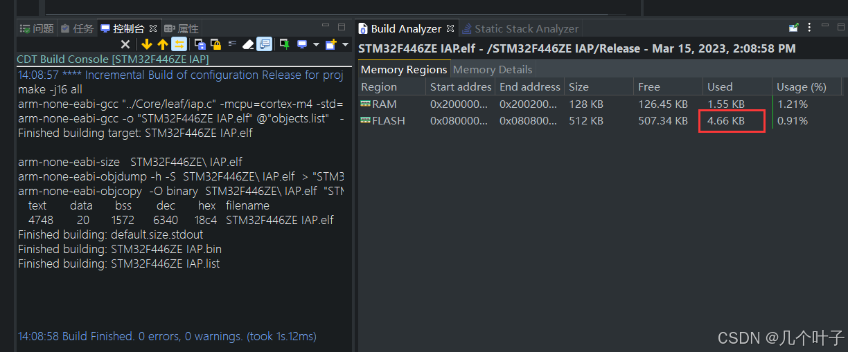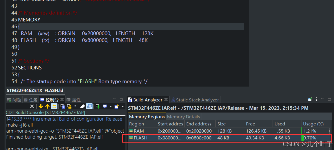 编译后文件大小4.66K。为了方便修改bootloder不给它极限空间(给的大小要是512byte的倍数即0.5K的倍数),给它flash大小给大一点给48K。代码上接写48K。