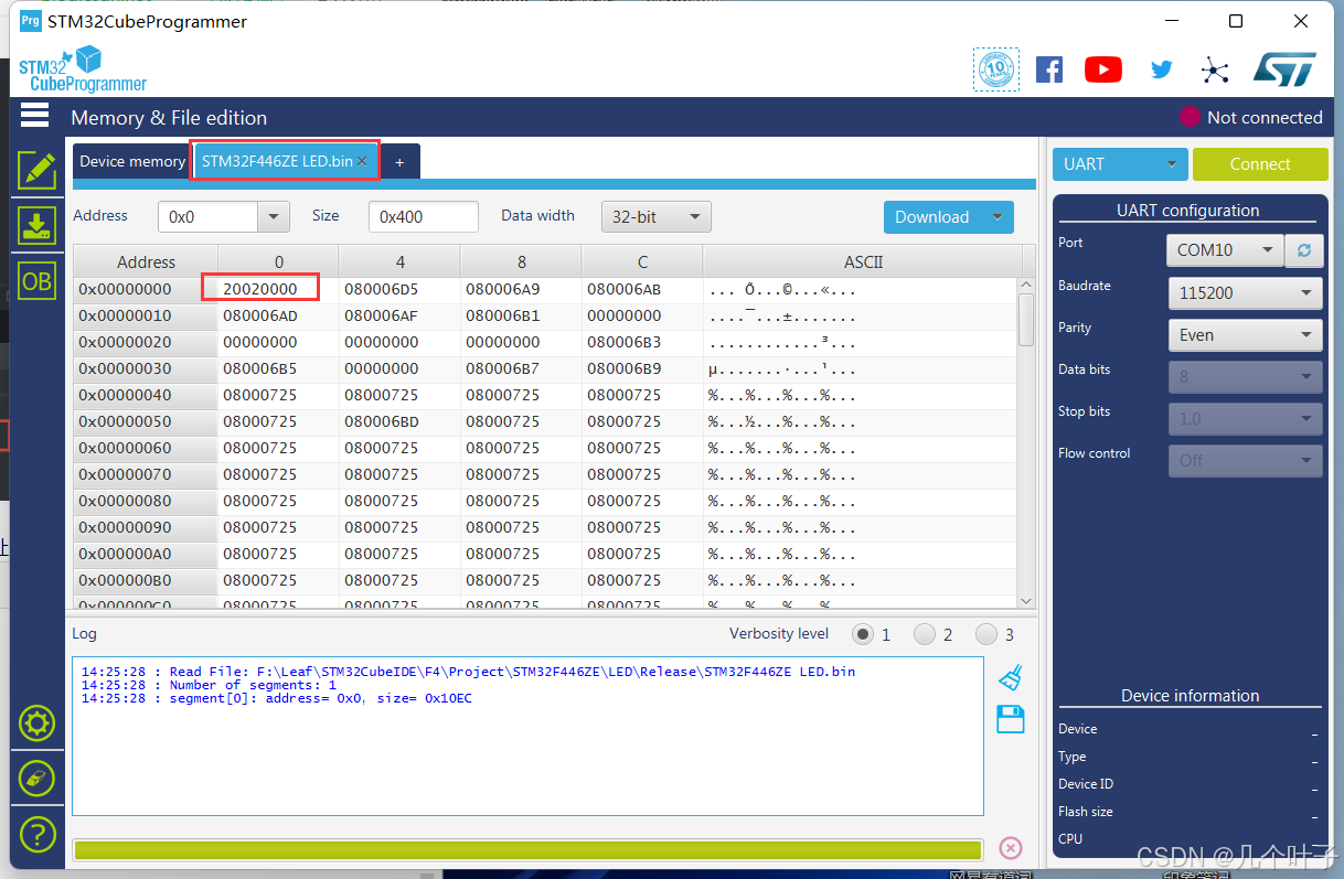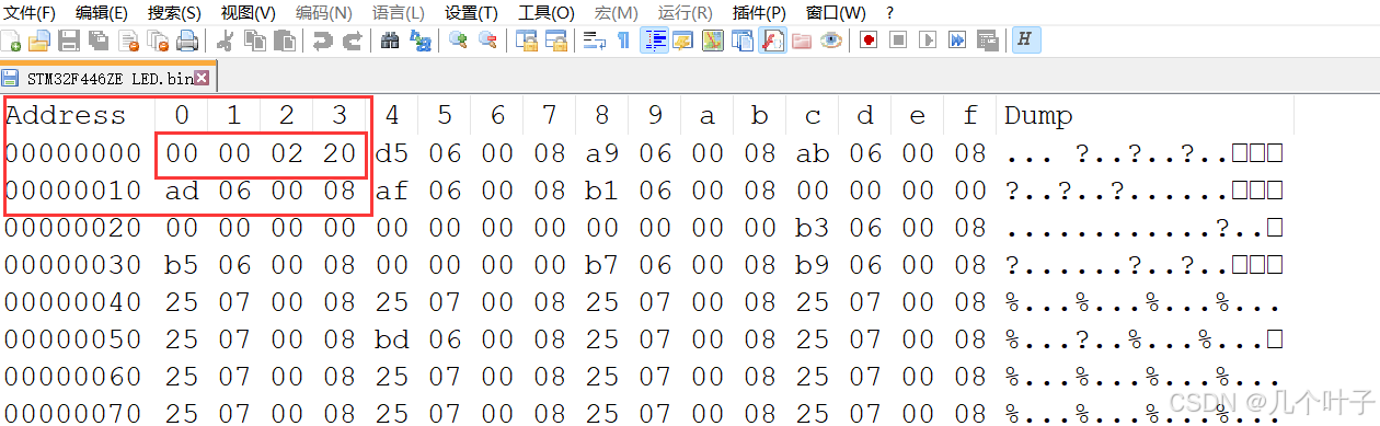 Notepad++是显示的byte数据,STM32CubeProgrammer显示的是Uint32数据,这里转换一下得到的一样0x20020000。