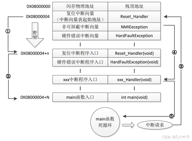 STM32F4 在复位后,先从 0X08000004 地址取出复位中断向量的地址,并 跳转到复位中断服务程序,如图标号①所示;在复位中断服务程序执行完之后,会跳转到我们 的 main 函数,如图标号②所示;而我们的 main 函数一般都是一个死循环,在 main 函数执行过 程中,如果收到中断请求(发生重中断),此时 STM32F4 强制将 PC 指针指回中断向量表处, 如图标号③所示;然后,根据中断源进入相应的中断服务程序,如图标号④所示;在执行完中 断服务程序以后,程序再次返回 main 函数执行,如图标号⑤所示。