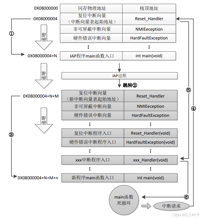 STM32F4 复位后,还是从 0X08000004 地址取出复位中断向量的 地址,并跳转到复位中断服务程序,在运行完复位中断服务程序之后跳转到 IAP 的 main 函数, 如图标号①所示;在执行完 IAP 以后(即将新的 APP 代码写入 STM32F4 的 FLASH,灰底部分。新程序的复位中断向量起始地址为 0X08000004+N+M),跳转至新写入 程序的复位向量表,取出新程序的复位中断向量的地址,并跳转执行新程序的复位中断服务程 序,随后跳转至新程序的 main 函数,如图标号②和③所示,同样 main 函数为一个死循环,并 且注意到此时 STM32F4 的 FLASH,在不同位置上,共有两个中断向量表。