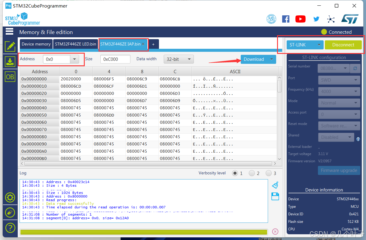 打开STM32CubeProgrammer,打开我们的app程序,可以你看见0地址上的栈顶地址,需要根据这个填写bootloder红色处的地址:
